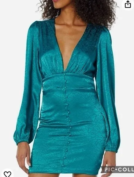 Bebe Teal Blue Satin Button-up Jacquard Mini Dress ~ gorgeous floral jacquard fabric elevates this... Show more