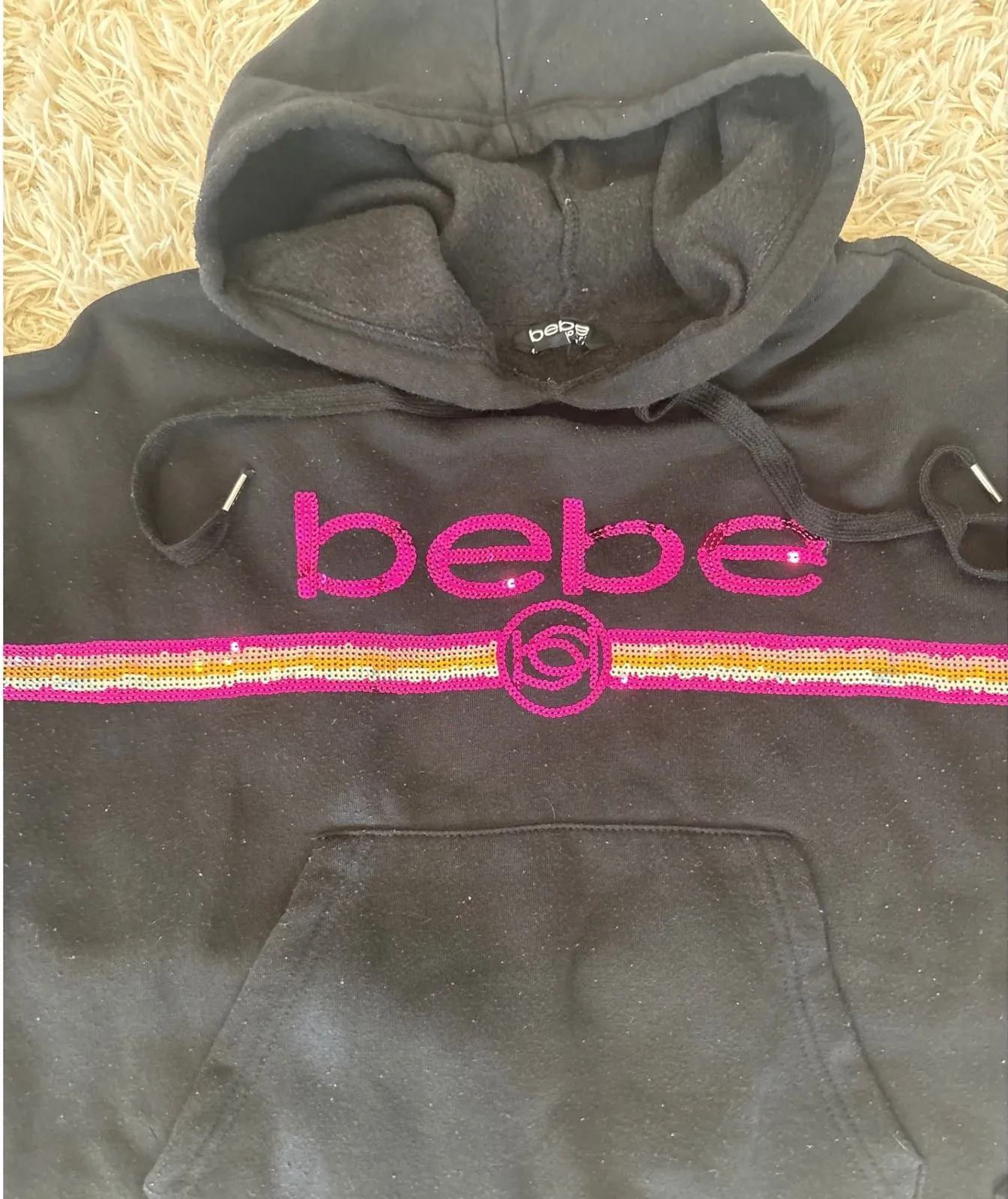Sparkle and shine in this eye-catching Bebe Sport black hoodie. The bold pink sequin logo across the chest, accented with a shimmering stripe, adds a touch of playful glamour. Crafted for comfort and style, this hooded sweatshirt features a soft fleece lining perfect for cozying up. The iconic Bebe logo, embellished with vibrant sequins, makes a statement. Ideal for casual outings, running errands, or lounging in style, this hoodie brings a fun and fashionable vibe to any casual ensemble. Vwo Measurements: • Chest: 23 in • Length: 23 in • Sleeve Length: 22 in Style: Pullover Department: Women Type: Hoodie Closure: Pullover Theme: Logo, Designer Features: Hooded, Pockets, Graphic Print Fabric Type: Knit Sleeve Length: Long Sleeve Neckline: Crew Neck Performance/Activity: Gym & Training, Casual Season: Fall, Winter, Spring Fit: Relaxed Occasion: Casual, Activewear Keywords: Bebe hoodie, sequin sweatshirt, pink logo, graphic hoodie, fleece lined, plus size activewear, casual comfort, athleisure, streetwear, bling fashion, designer hoodie, logo apparel