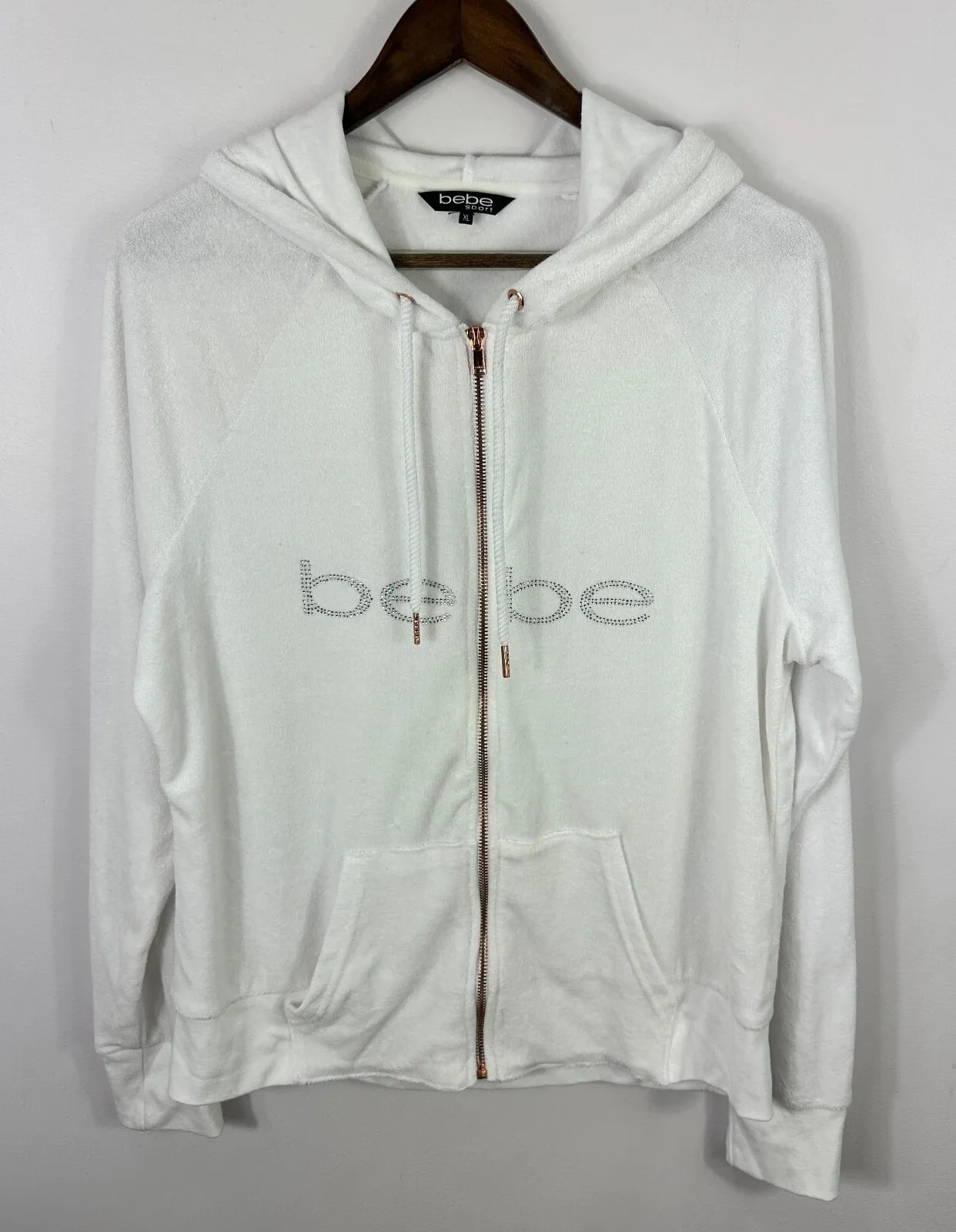 Bebe Sport Hoodie Womens XL White Terry Zip Rhinestone Logo Y2K McBling Glam Description: Channel y... Show more