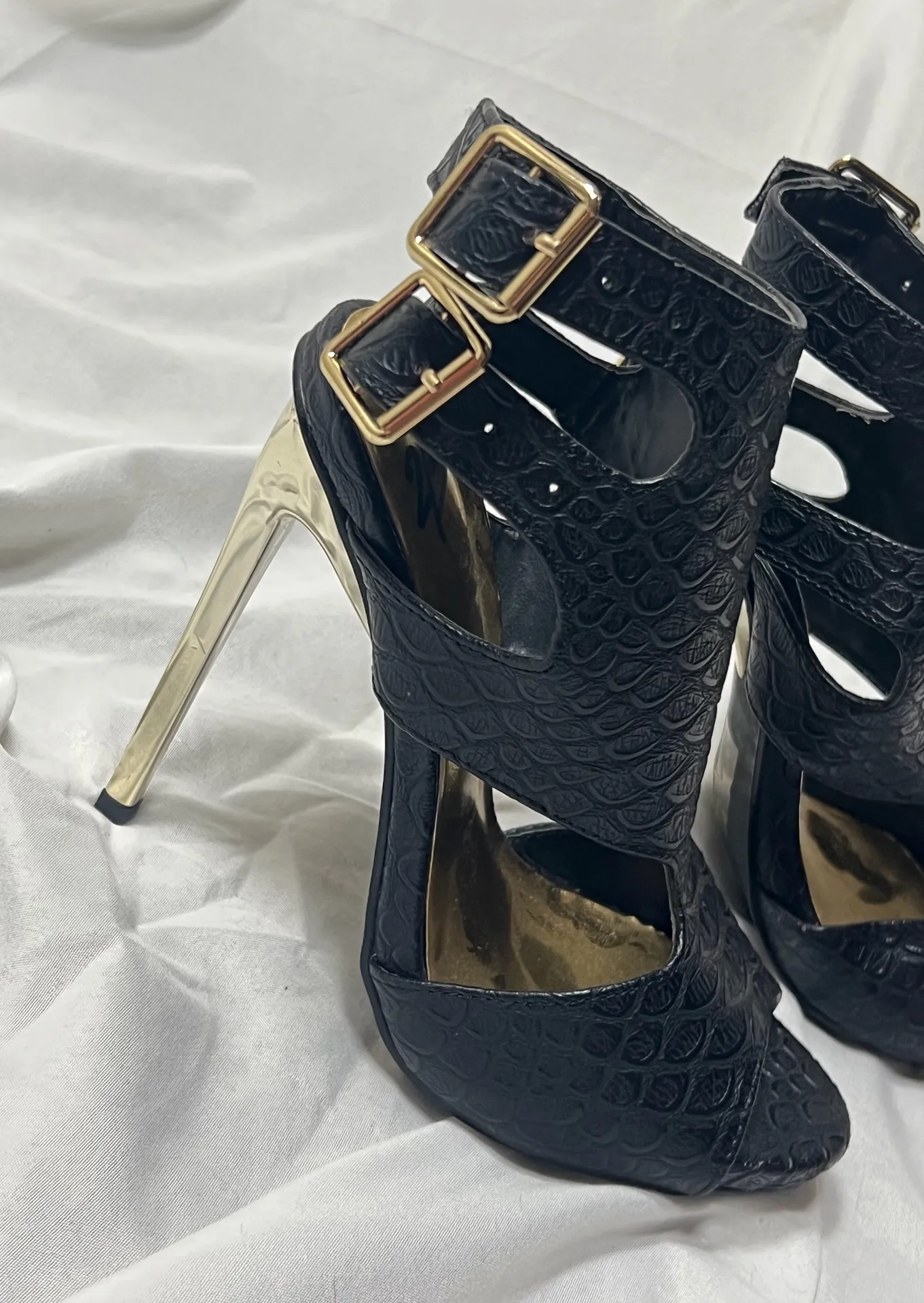 The Bebe Trisha Black Reptile Print Spiked Double Buckle 5” Stilettos in size 7 are a stylish and ey... Show more