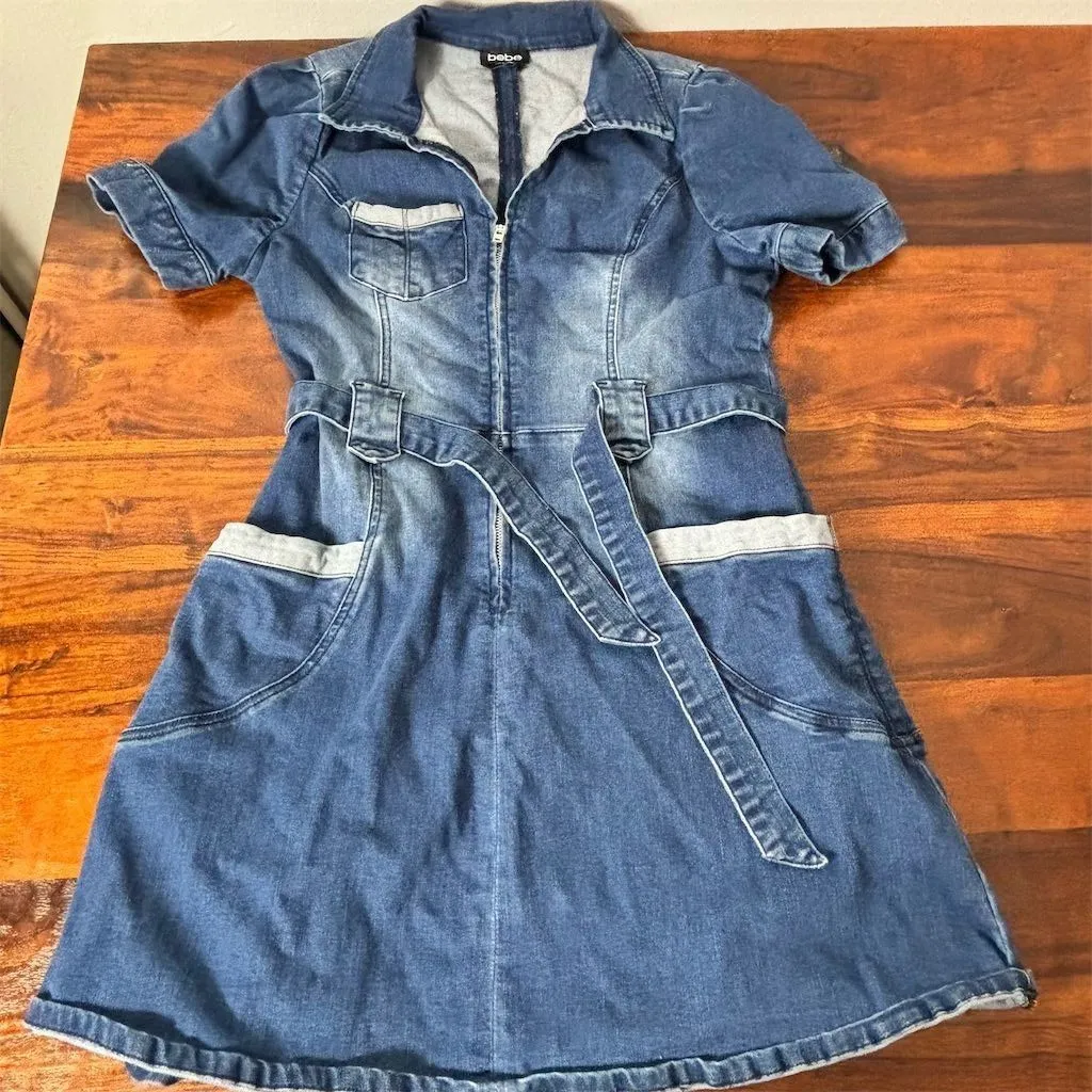 This bebe dress in size 10 features a zip-up style with a belted waist, offering a flattering fit. Made from a blend of cotton, polyester, and spandex, the denim fabric is both flexible and durable. The knee-length dress in blue is designed for women and is suitable for spring. It has short sleeves and a zip closure, making it ideal for casual outings or semi-formal events. Manufactured in China, it is machine washable for easy care. The dress is pre-owned. Keywords: bebe dress, size 10, zip-up, belted waist, knee-length, blue dress, women's fashion, spring dress, denim, casual wear, semi-formal, machine washable.