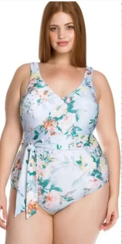 Brand new with tags BECCA by Rebecca Virtue Femme Flora One Piece Swimsuit in Blue Light blue with allover garden floral print in a variety of colors. Features tie detailing at side waist. Scoop neck at back. Removable cups. 91% polyester 9% spandex Plus Size 0X