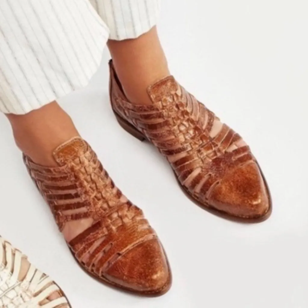 Bed Stu Size 9 women's US Style: Las Cruces Shoes Brown leather closed toe shoes in strappy styling Pointed toe; Leather is factory distressed as pictured Zip in back; So unique In good condition with factory distressing and what could be some minor wear as pictured.