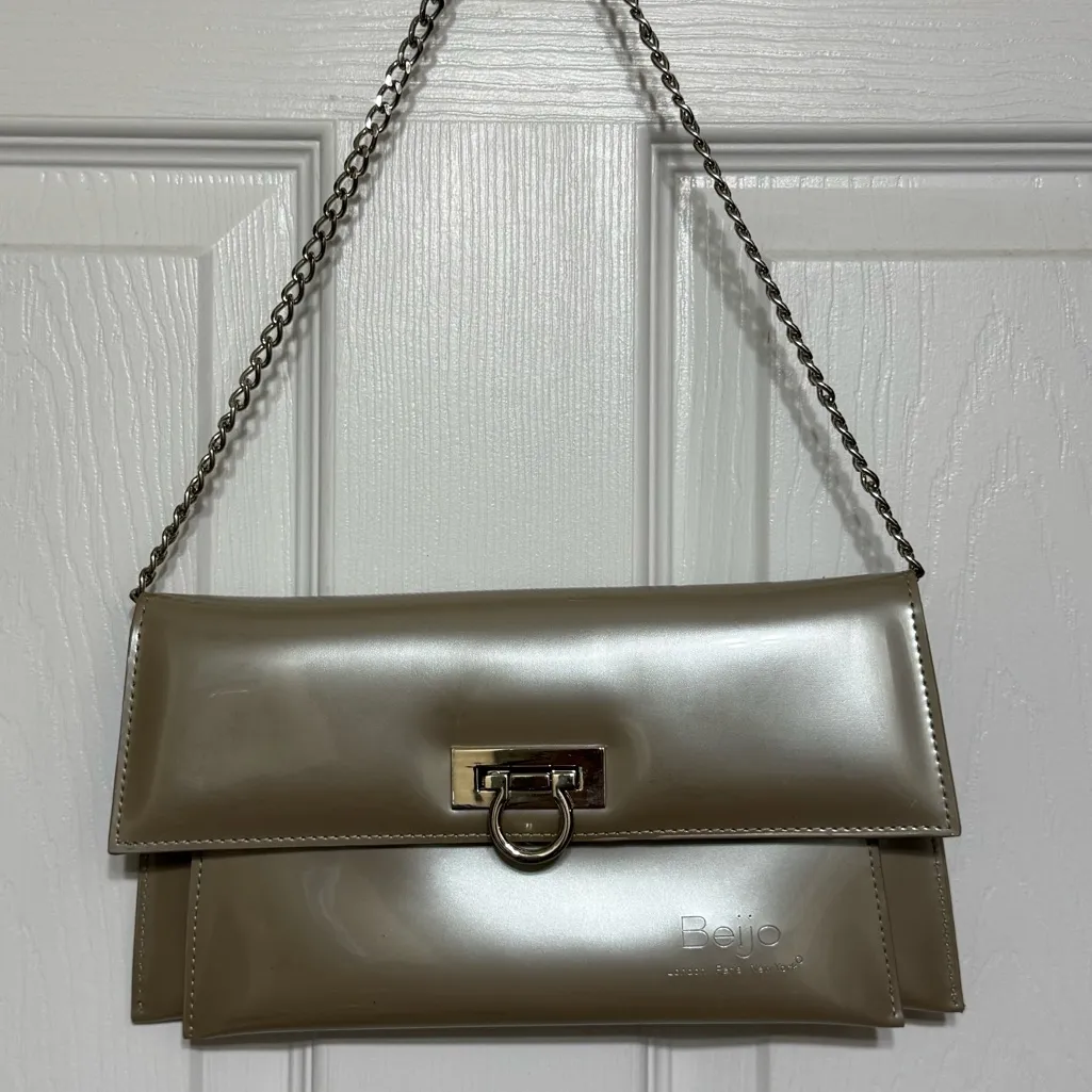 Strap Good pre-owned condition with some wear shown. Please see all photos. The Beijo Champagne Pearl Clutch is a sophisticated accessory, featuring a sleek, structured design with a lustrous metallic finish. Its minimalist style and elegant color make it a perfect choice for formal occasions. The clutch's smooth, glossy surface and subtle chain strap detail add a touch of luxury to any ensemble. ***Pet friendly, smoke free home*** Check out my other fun and unique items I ship same or next business day!!