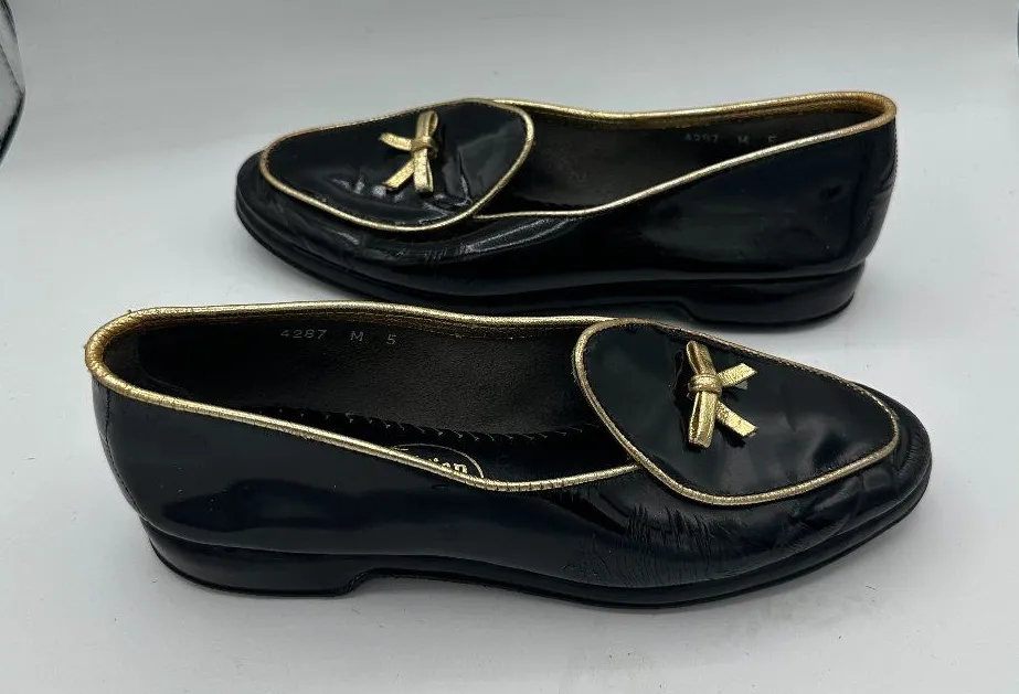 Belgian Shoes Midinette Loafers Black Patent Leather Gold Trim Bow M 5 (4287) - $125 - From Amber