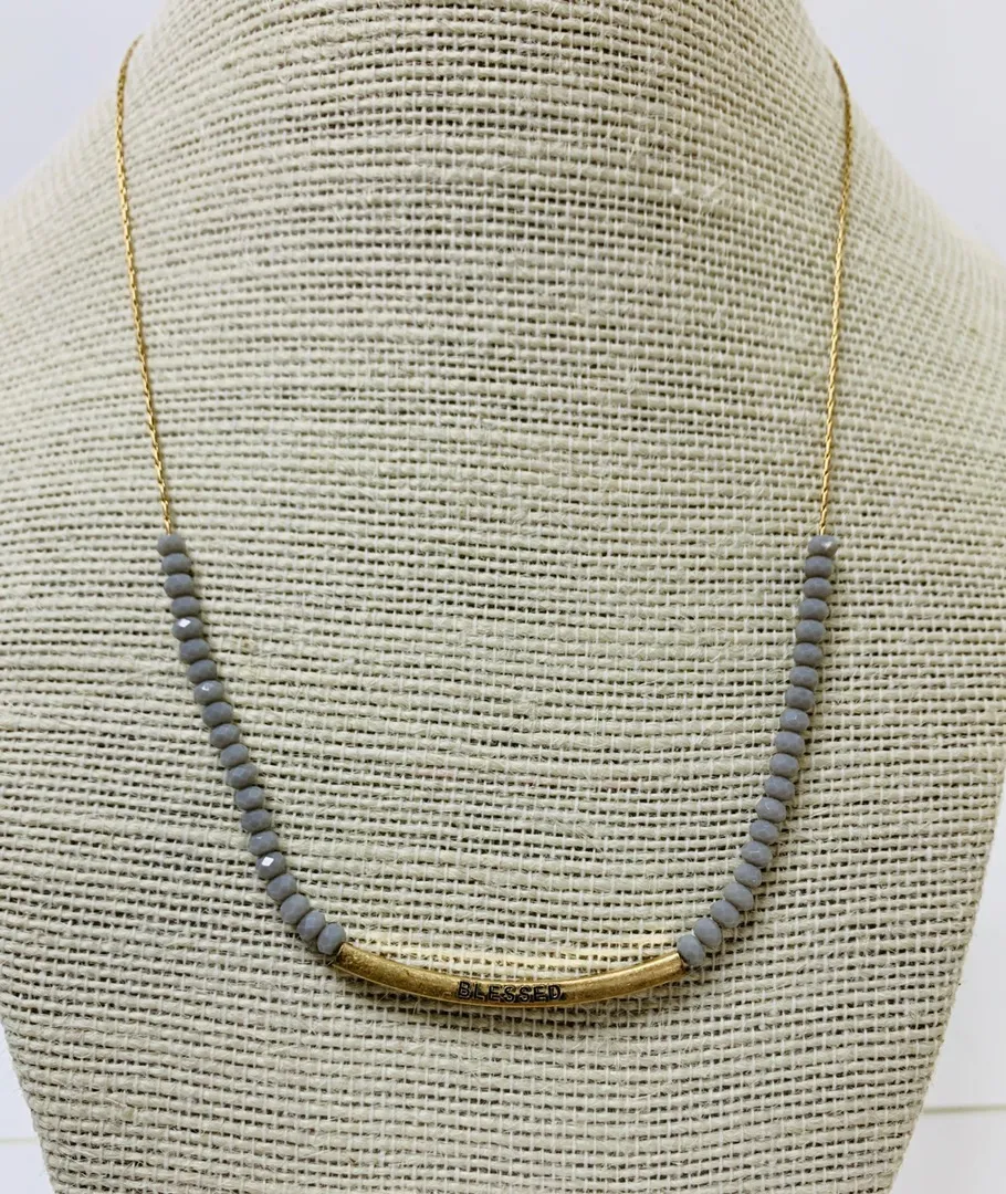 Inspirational blessed bar necklace surrounded by gray glass beads on a gold satin metal chain. Each... Show more