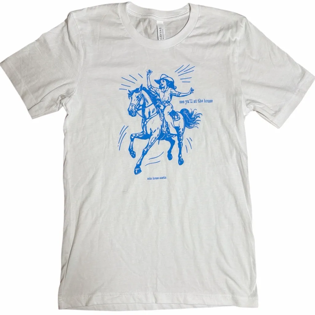 Vintage-style graphic T-shirt from SoHo House Austin, featuring a bold blue western cowgirl riding h... Show more