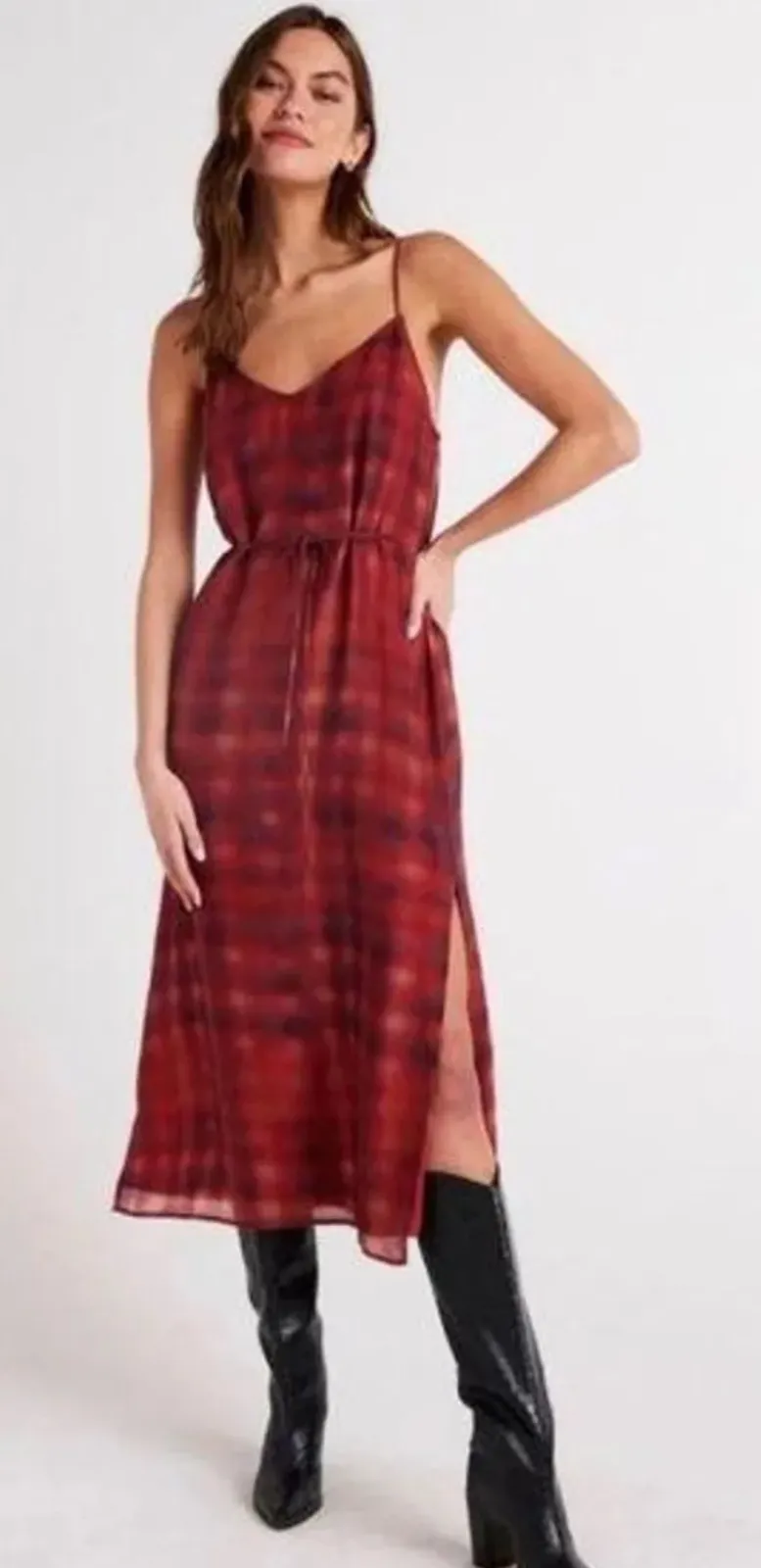 Excellent pre-owned condition. No flaws noted. • Rich burgundy red plaid pattern • Midi length with side slit for movement • Adjustable spaghetti straps • Flattering drawstring tie waist • Made in the USA • 80% Tencel, 20% Nylon – breathable and soft feel • Style #: B6598-G45-304 Bella Dahl dress, plaid slip dress, plaid midi dress, cottagecore, fall dress, grunge chic, soft girl, 90s style, Y2K style, adjustable strap dress, Tencel dress, comfy casual dress, anthropologie, burgundy dress, red plaid dress, festival outfit, edgy boho, west coast vibes, made in USA, minimalist, quiet luxury, modern romantic, sustainable fashion, preppy grunge, Bella Dahl size small, streetwear femme, transitional wardrobe, coastal cowgirl, indie fashion, feminine slip dress, revolve, sunset, summer, beach, cami