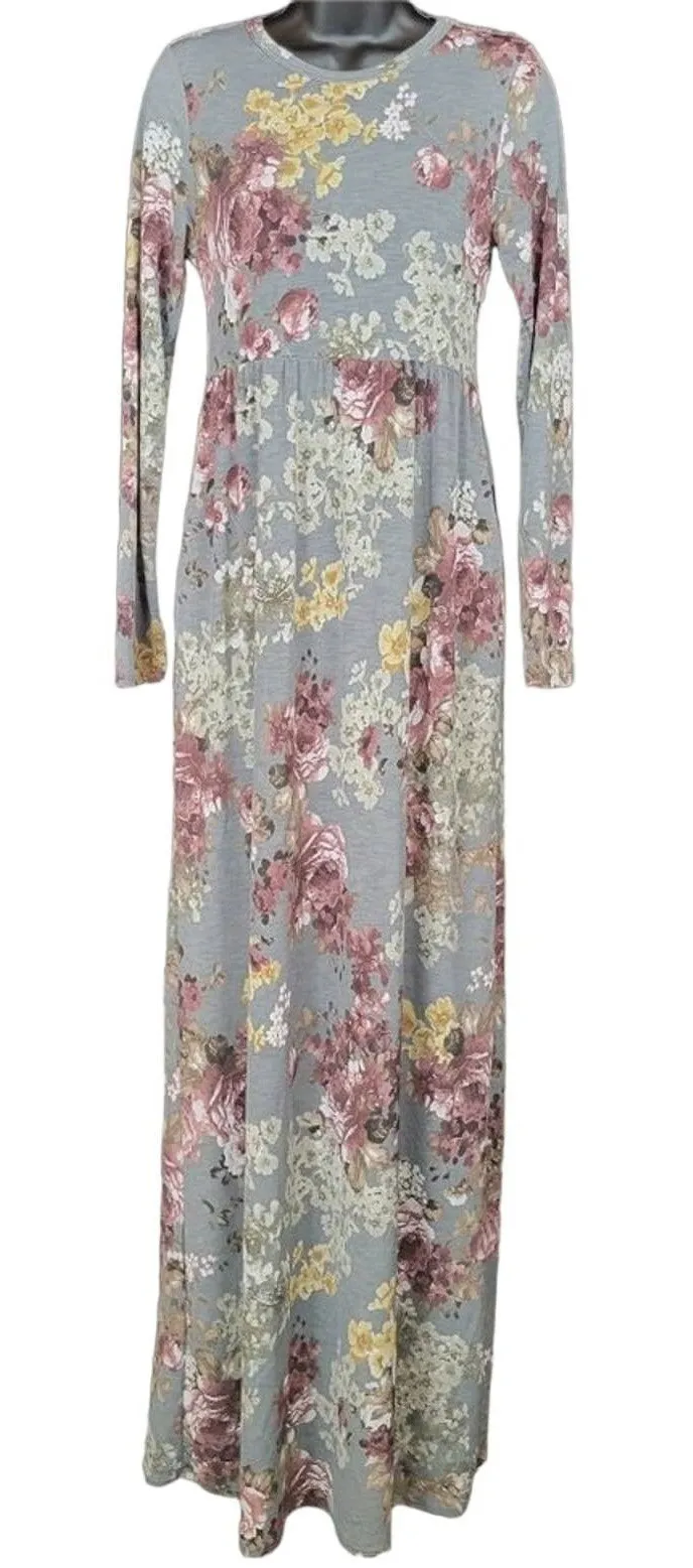 Romantic, effortless, and ultra-feminine – this Bellamie floral maxi dress features a beautiful flowy silhouette with long sleeves and two hidden seamline pockets for a practical twist. Made from a stretchy, lightweight fabric, it's as comfortable as it is flattering. Approximate Flat Measurements: Bust: 15" Waist: 13" Hips: 19" Flare: 26.5" Strap to Hem: 62.5" Waist to Hem: 47" In great preowned condition with light overall wear and no known flaws. Clean, smoke-free storage. Keywords: Bellamie, maxi dress, floral, long sleeve, grey, feminine, casual, boho, spring, fall, comfortable, everyday, printed dress