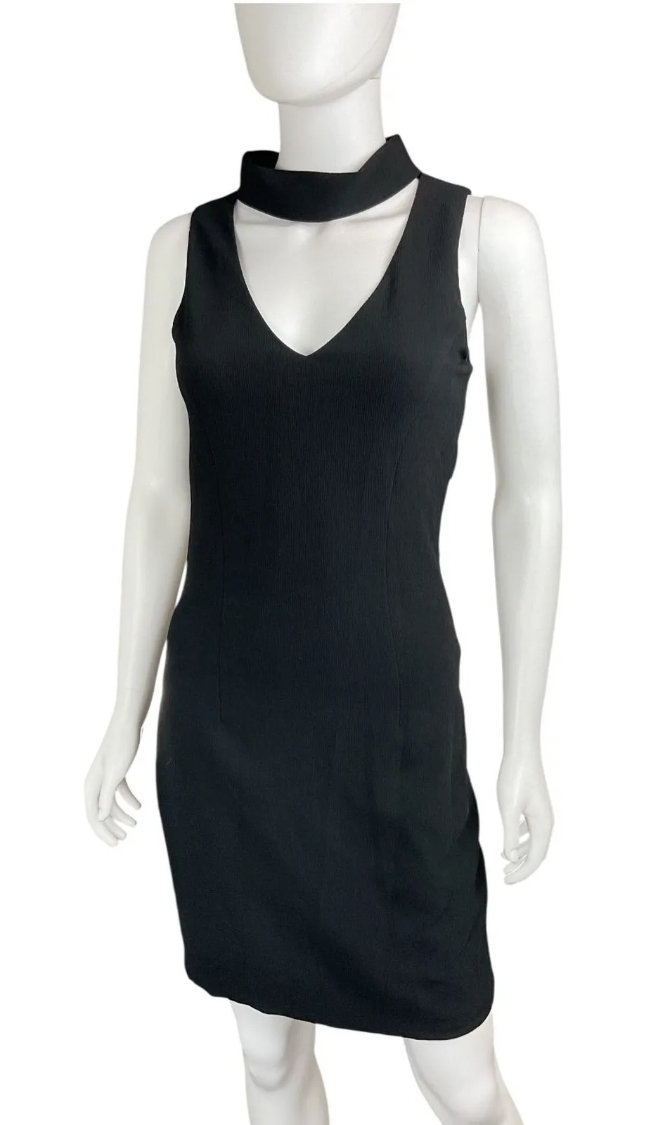 Sleek and sophisticated sleeveless dress, perfect for making a statement at any event. This bodycon dress features a flattering V-neckline with a unique choker neck detail, accentuating the shoulders and adding a touch of modern elegance. Its tailored silhouette enhances your natural curves, creating a streamlined and polished look. The dress closes with a rear zipper. This dress is ideal for cocktail parties, date nights, or special occasions where you want to exude confidence and style. Measurements: • Length: 35 inches • Chest (pit to pit): 17 inches Style: Bodycon, Pencil Dress, Sheath Dress Length: Knee Length Color: Black Department: Women Sleeve Length: Sleeveless Pattern: Solid Occasion: Party/Cocktail Material: Polyester, Spandex, Polyester Blend Neckline: V-Neck Character: Elegant, Sophisticated, Modern, Classic, Chic Fabric Type: Woven Keywords: black dress, sleeveless dress, choker dress, v-neck dress, cocktail dress, party dress, bodycon dress, little black dress, womens dress, elegant dress, modern dress, stylish dress, Badgley Mischka, Belle Badgley Mischka