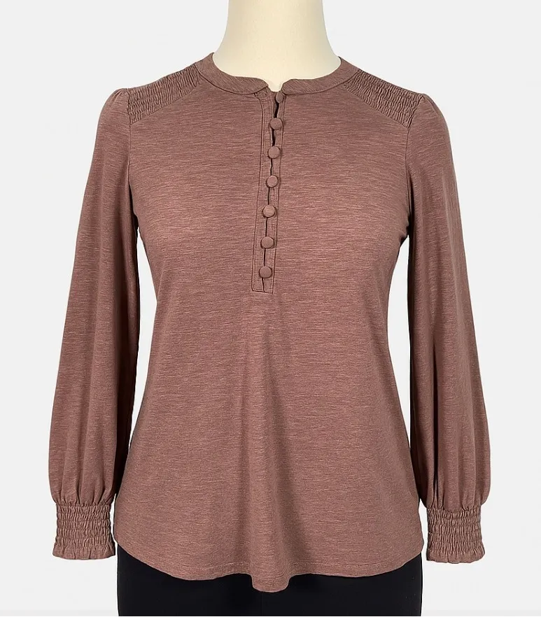 Belle by Kim Gravel Button Henley Top Smocked Shoulder Long Sleeve Mauve XXS Women's Size XXS Colo... Show more