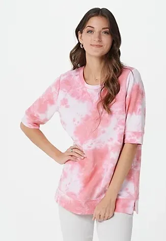 New in bag. Never opened. Sold out online. Photos at the end are for reference in the pink color, this sweatshirt is light aqua! Bring that youthful radiance from within to your do-it-all looks with the help of this on-trend tie-dye sweatshirt. From Belle by Kim Gravel. Fabrication: French terry knit Features: round neckline, allover tie-dye print, elbow-length sleeves, banded sleeve and bottom openings, 2-1/2" side vents Fit: semi-fitted; follows the lines of the body with added wearing ease Length: missy length 26-1/2" to 28-5/8"; plus length 29" to 32-1/2" Content: 58% cotton/37% modal/5% spandex Care: machine wash, dry flat Imported