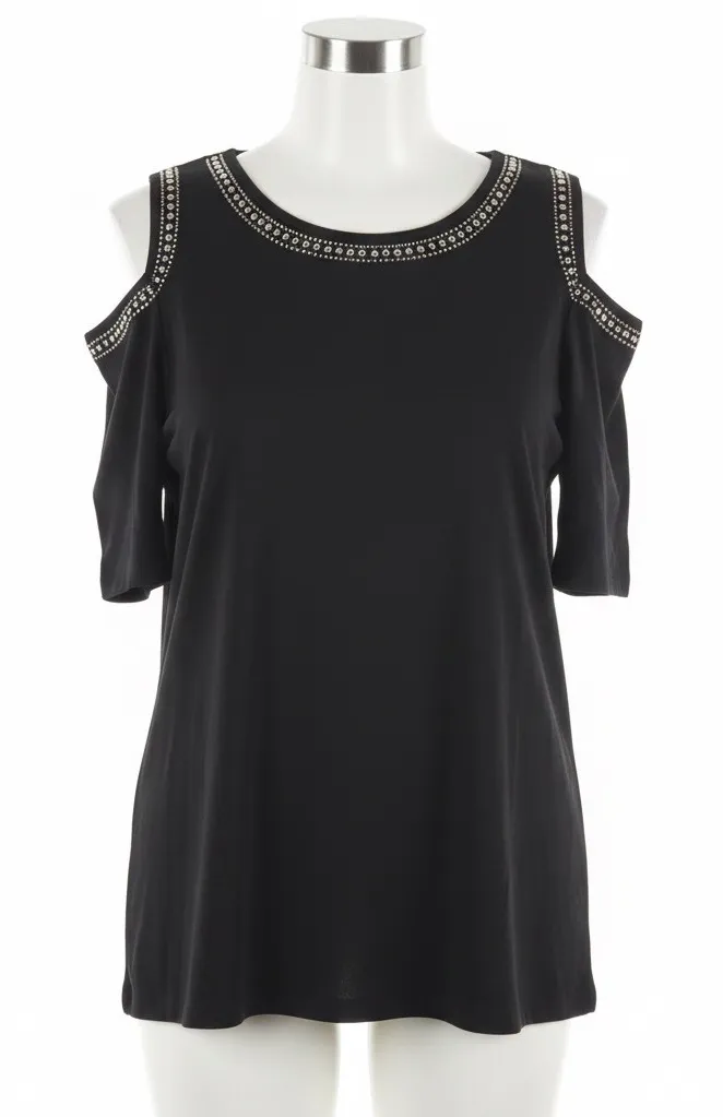 Type: Shirt Style: Tunic Material: Cotton, Modal, Spandex Neckline: Scoop Neck Sleeve Length: Short Sleeve Sleeve Type: Cold Shoulder Sleeve Pattern: Solid Accents: Beaded, Studded jewel neck, rhinestone, beaded, casual, evening, party, chic, elegant, soft, stretch, comfortable, whimsigoth, mall goth, dark academia, coquette, rocker chic, biker, edgy, alt, alternative, indie, bohemian, textured, dark, minimal goth, eccentric, maximalist, romantic goth, victorian, gothic, studded, embellished, cold shoulder, night out, concert Measurements are Approximate: Length 27" Armpit to Armpit 21" New with Tag. Please see photos for measurements, condition and details. Please Verify Measurements. (7812)