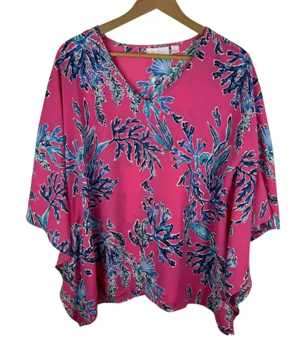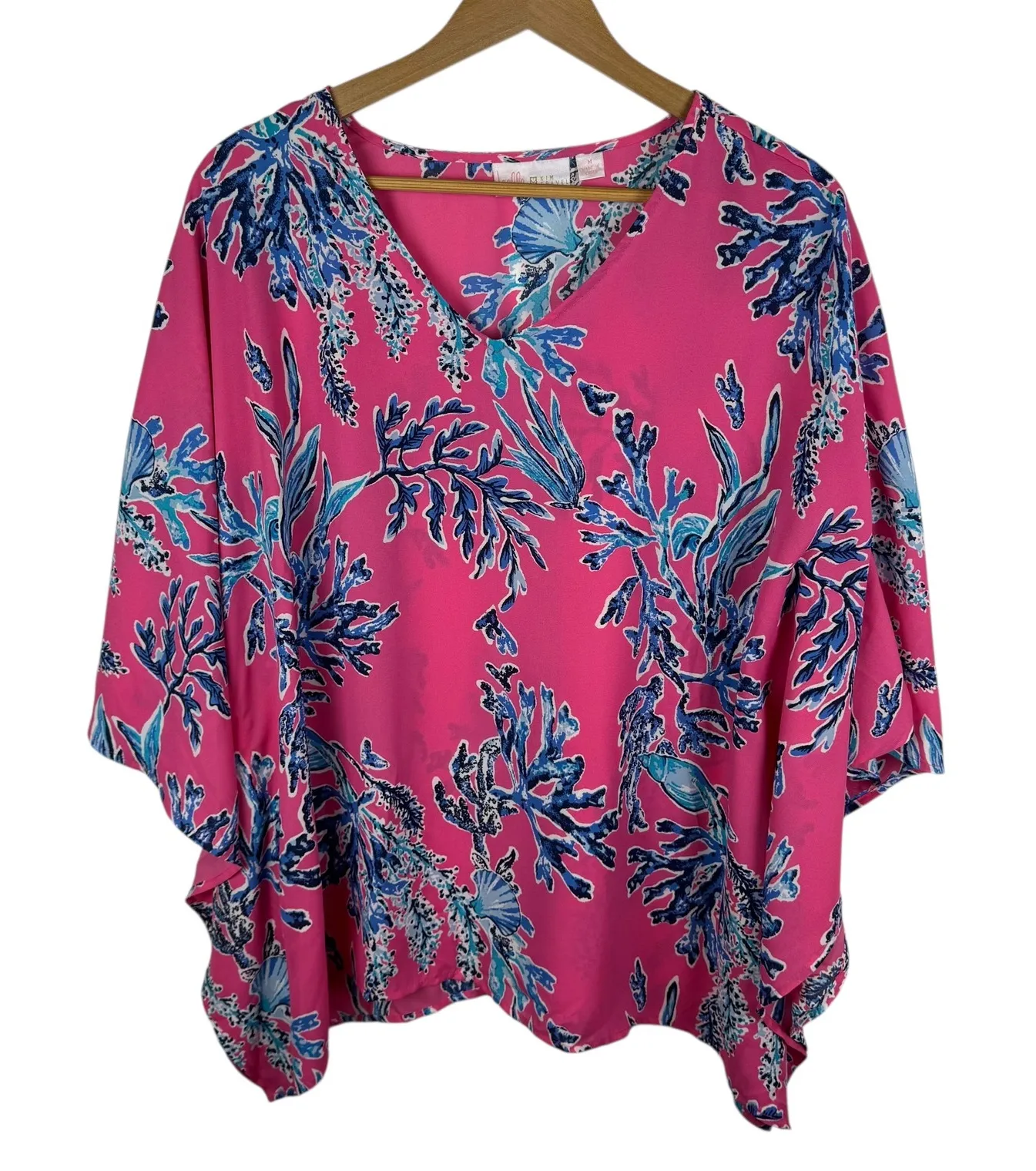 Flowy caftan top with a vivid and eye-catching design. Featuring a vibrant pink backdrop adorned with a blue coral reef and seashell print, this top exudes a tropical and breezy vibe. The relaxed fit, V-neckline, and wide sleeves offer both comfort and style, making it an ideal choice for warm weather. Perfect for a casual beach outing, a summer brunch, or a relaxed evening gathering with friends. Color: Pink Type: Blouse Department: Women Style: Kimono Material: Polyester Neckline: V-Neck Sleeve Length: 3/4 Sleeve Sleeve Type: Kimono Sleeve Pattern: Floral Features: Sheer, Lightweight, Flowy, V-Neck Fit: Relaxed Keywords: caftan top, floral print, coral reef, v-neck, kim gravel, belle, pink blouse, blue print, beach wear, cruise wear, resort wear, flowy top, boho, QVC Fashion, Medium Blouse, Tropical Print Top, Resort Wear, Vacation Blouse, Beachwear, Kimono Sleeve Blouse, Summer Tunic, Bright Pink Blouse, Boho Chic, Feminine Style, Flowy Top, Casual Blouse, Cruise Wear, Preppy Excellent Pre-Owned Condition (see pics for details) Flaws: No visible flaws. Measurements: included in photos. Please compare the measurements to something you already own for a great fit! Fast shipping: Shipped out next business day! Please let us know if you have any questions!