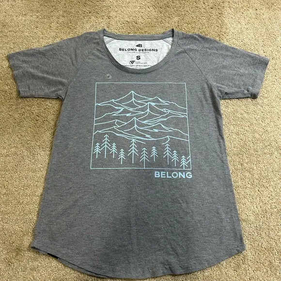 The Belong Designs Women’s Small Gray/Blue Mountain Landscape Short Sleeve T-Shirt is a stylish and versatile top perfect for travel, casual wear, or work. Made from a blend of recycled polyester, bamboo rayon, and spandex, this lightweight and breathable t-shirt features a comfortable crew neck and casual sleeve design. The pullover closure and regular fit make it easy to wear year-round, whether you're layering in winter or staying cool in the summer. With its nature-inspired design and easy care instructions, this t-shirt is a practical and fashionable addition to any wardrobe. Retails for $44.