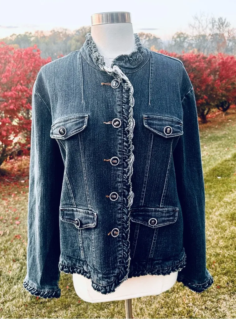 Blue denim jacket Button Front Closure Lace Embellishment Trim 4 front Button snap Pockets Stand... Show more