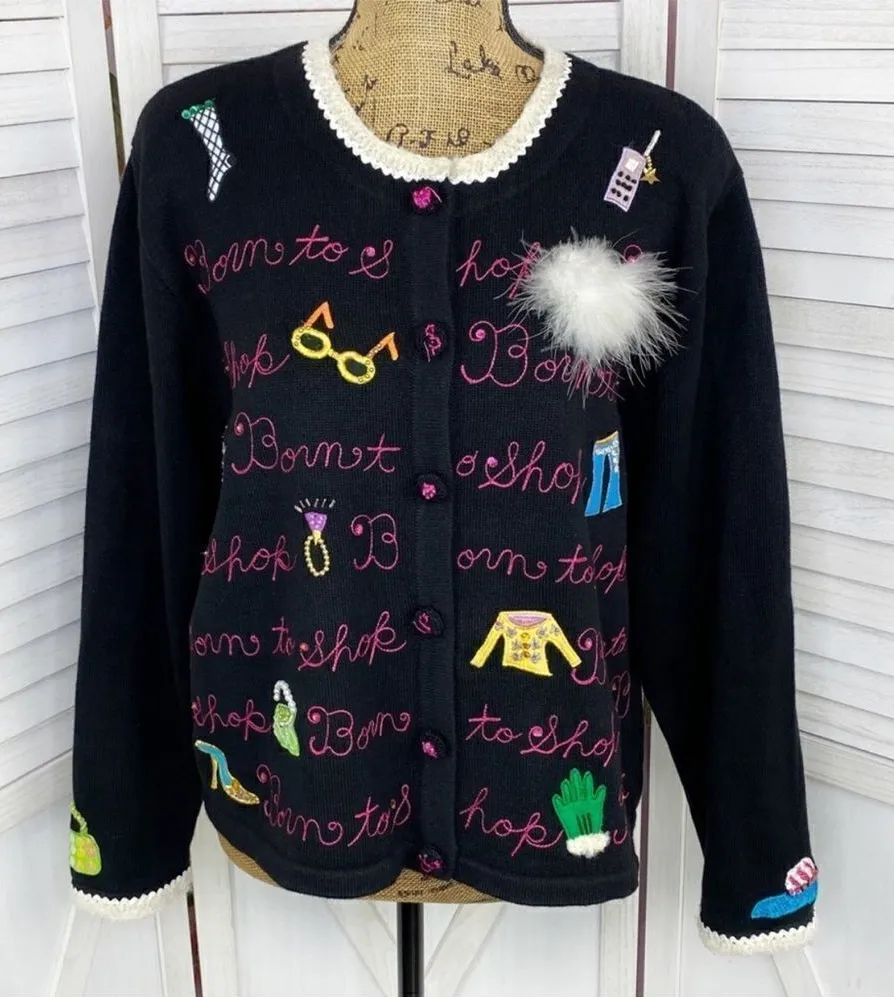 Vintage Berek Born To Shop Appliqué Embroidered Cardigan Sweater Size XL So many cute details, from the furry purse, the brick cellphone, Shoes, Dresses, Hats, Purses, All the things we love to buy Onyx black knit Appliqué & sequin details Born To Shop all over embroidery Reverse button front Ribbon & faux pearl trim Hip crop length Long sleeve Armpit to armpit 22” Length shoulder to hem 23” 90s Vintage Barbiecore Shopping Chunky Elle Woods Sequins Shopping Resortwear Funky Pearls Legally Blonde Cardigan Kitschy Appliqué Textured 3D Long sleeve Retro 80s Fun Colorful Fuzzy Neon Multicolor Dopamine dressing Statement sweater Twee #DD”