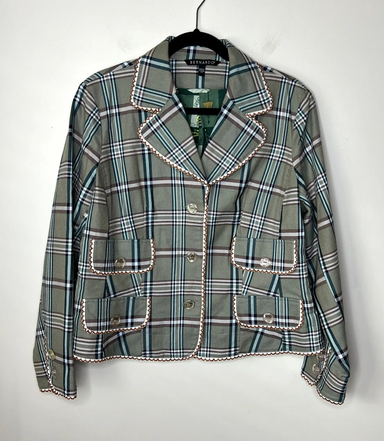 Bernardo Size 14W Women's Green Plaid Excellent preowned condition. No wear, stains, or imperfections - This jacket has so much going for it! Clear flower buttons down the front and on the cuffs, contrasting scalloped trim throughout the entire jacket, four pockets on the front, notched collar, fun and playful lining, etc. Y2K 90s Twee Indie Schoolgirl Blazer APPROX. MEASUREMENTS: *Measurements are taken with item lying flat on the floor. Pit to pit: 22" Shoulder to hem: 22" Thank you for checking out my item! Please let me know if you have any questions. All pre-owned items have been washed according to item label directions and stored in a pet and smoke-free home. *Disclaimer: colors may vary across various viewing devices.