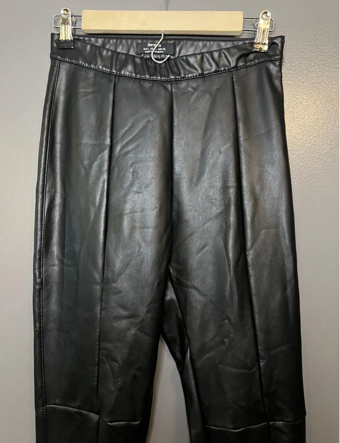 Previously worn faux leather leggings with light creasing and minor surface wear from use and storage. Fabric is clean and intact with no holes or stains. Side zipper and seams are secure and functional, waistband retains good stretch. Brand: Bershka Style: Womens faux leather-look high-rise ankle leggings with a slim leg silhouette. Color: Black; Size: L (EUR L / USA L / MEX 30 per tag). Material: 92% polyester, 8% elastane. Features: Coated faux leather finish, elasticized waistband, side zip closure at the waist, front leg seams for a tailored look, slim tapered legs to the ankle, stretchy body-hugging fit suitable for casual, night out, or edgy streetwear styling. Style/Model information: Made in Cambodia. Waist 24" has stretch Rise 11" Inseam 28" bin 98 2609