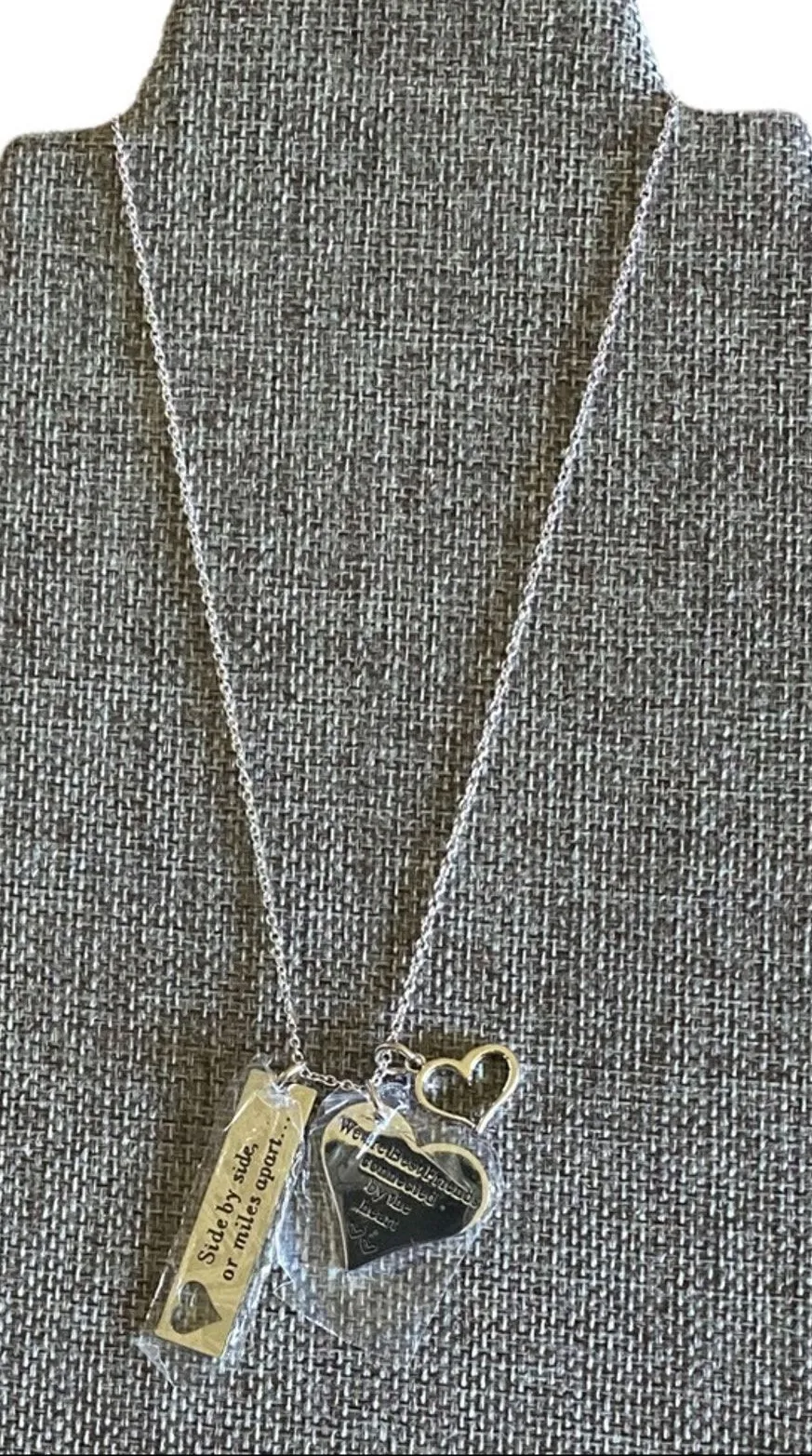 * Brand new * Silver toned necklace * 3 charms * Charms are removable * 1 heart * 1 says "Side by side or miles apart" * 1 says "We are best of friends connected at the heart" * End to end this measures approximately 22” * No markings for purity * Comes with gift box