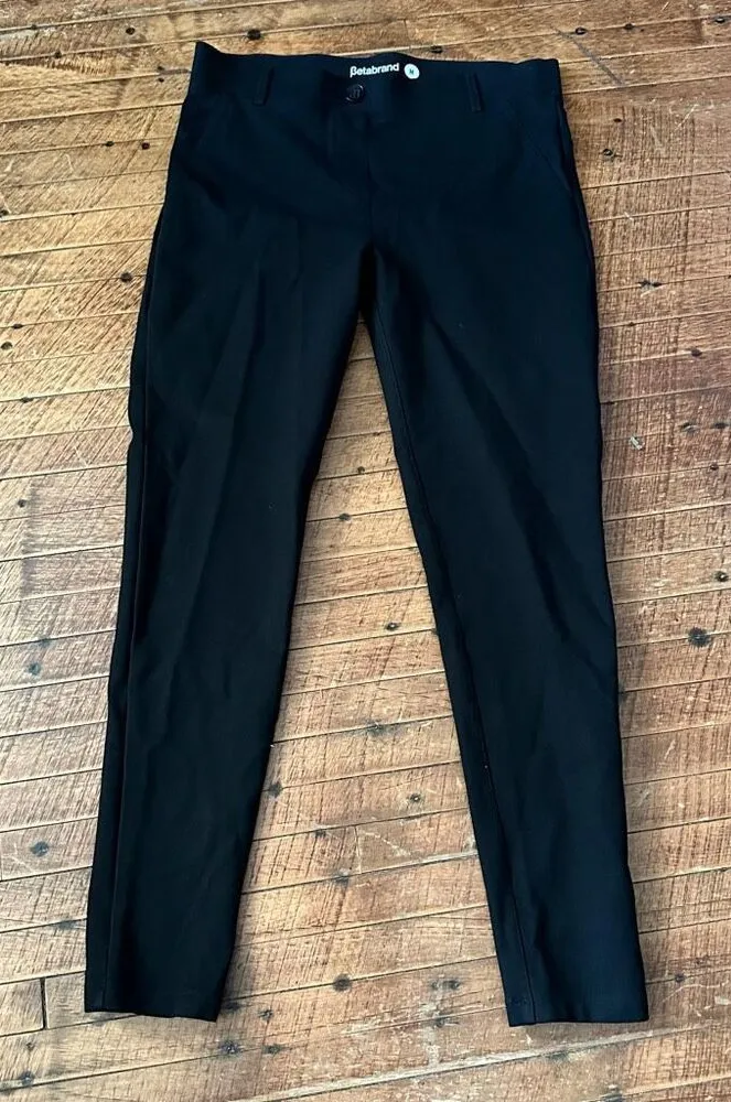 Betabrand business casual, black, flat front, comfortable, minimalist, classic pants . Stretchy and comfortable, with a professional look. Approximately 15 inches across the waist, 10 inch rise, and 28 inch inseam. In good, used condition. From a pet and smoke free house.