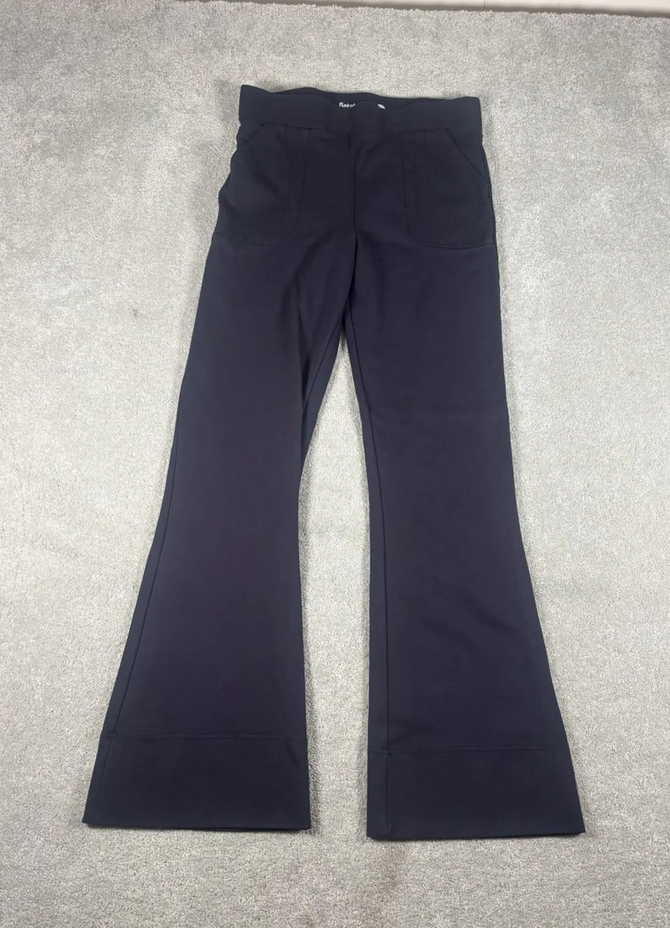 The betabrand Flare Leg Dress Yoga Pants in navy blue are a stylish and comfortable option for women. These pants feature a flared leg style, pockets, and are designed for a regular fit in size large. Perfect for a dressy or casual look, these pants combine functionality with a fashionable design that is both practical and chic. 7009