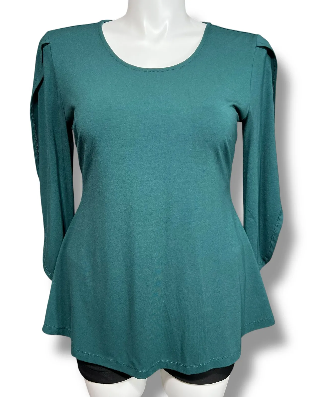 Swing Top Shirt Blouse Split Sleeve Scoop Neck Stretch Teal Betabrand Condition: Like New Size: XL Description: Swing top Pullover Scoop neck 3/4 length split sleeves Fit & Flare Soft and stretchy Solid teal green (more green than blue) Made in China Rayon Polyester Spandex Machine washable Approx measurements: 21" pit to pit 18.5" waist 27.5" length If purchased by noon central time I try to ship same day Weight: 13O SKU: Teal Scoop Neck Split Sleeve Stretch Swing Top Shirt Blouse Betabrand