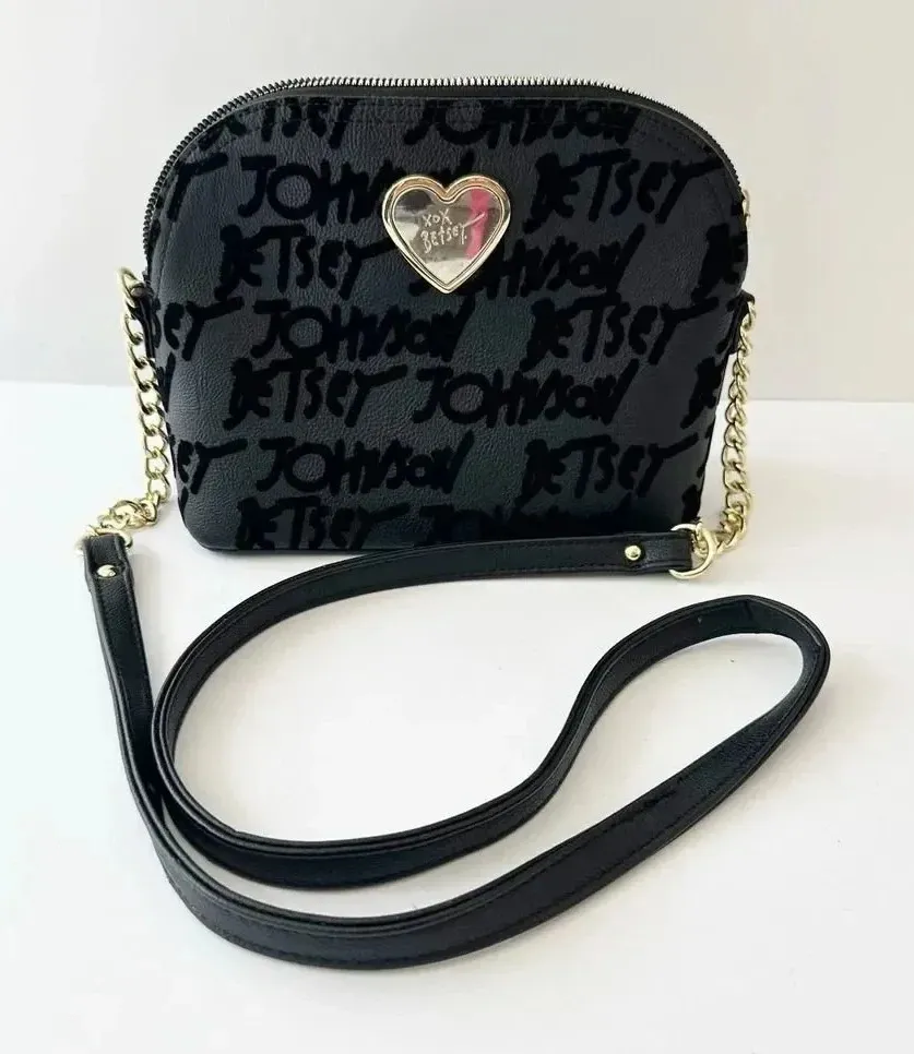 Black dome shaped purse with "Betsey Johnson" logo all over in textured black velvet. Contrasting re... Show more