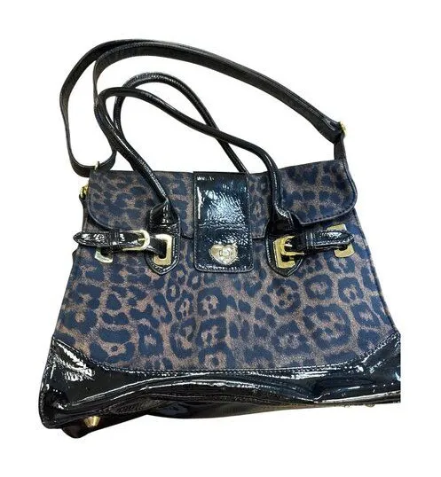 This Betsey Johnson handbag features a leopard print with patent leather accents, offering a chic an... Show more