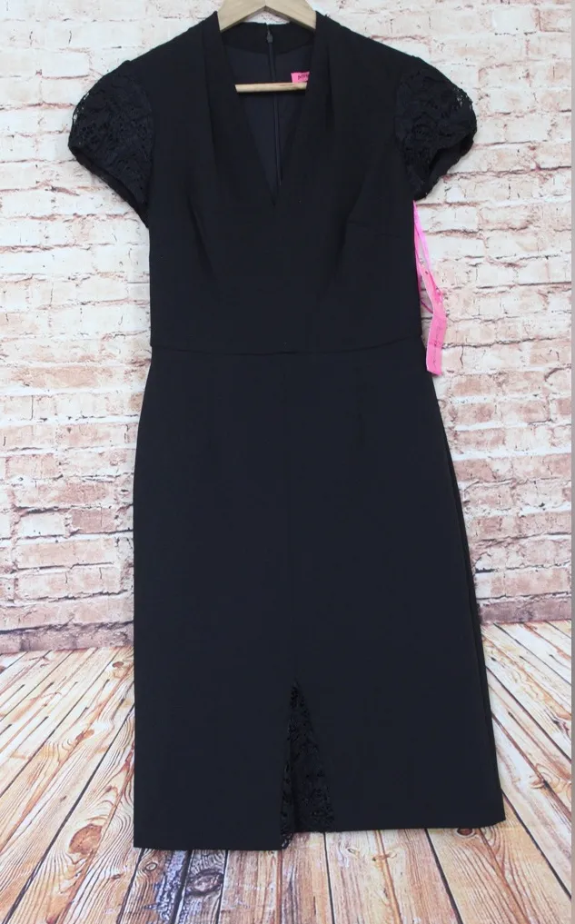 Chic black midi dress by Betsey Johnson. Features elegant lace sleeves and a flattering silhouette.... Show more