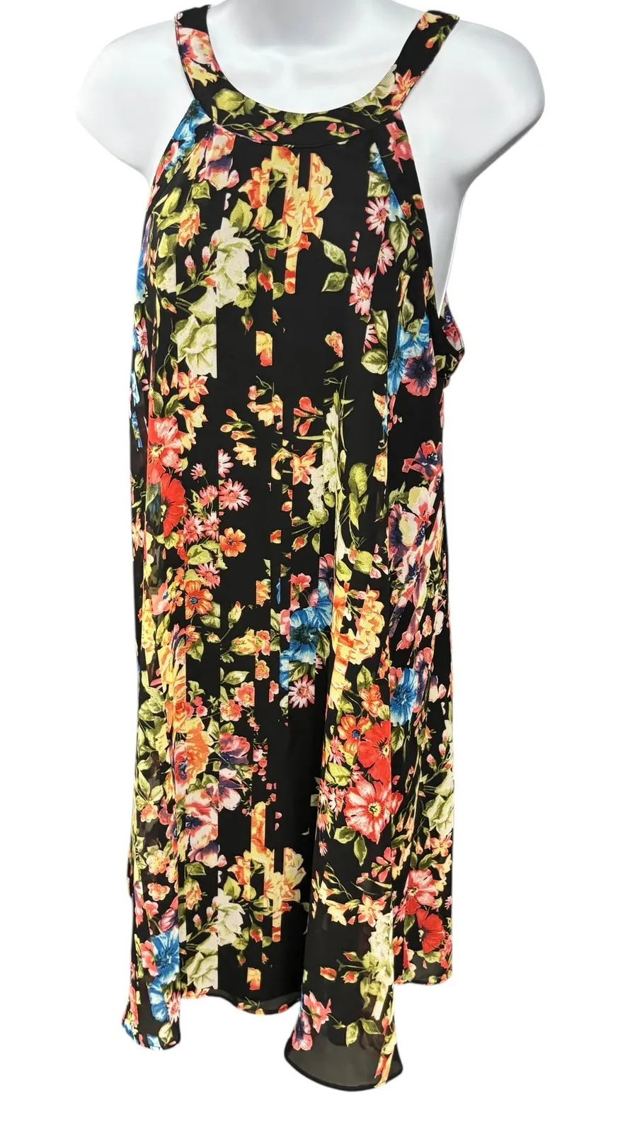 Keywords: Betsey Johnson, dress, midi dress, floral dress, sleeveless dress, halter dress, black dress, size 8, women's fashion, floral print, party dress, summer dress, casual dress, polyester dress, lined dress