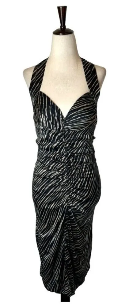 designer, luxury, silk, silky, 100% silk, retro, vtg, vintage, halter, classy, classic, spring, summer, fall, winter, all seasons, trendy, stylish, pretty, wedding, party, cocktail, date night, sheath, sexy, sex pot, slimming, ruched, ruching, form-flattering, trendy, holiday, party, Valentin'e's day, Valentine's, Wedding Guest, wedding, cocktail, party, Party, Cocktail, Dancing, Glam, Sparkly, Sparkle, Glitter, Prom, Pageants, Photoshoot, New Year’s Eve, Holiday, Wedding, Graduation, Size 8, M, Med, Medium, Animal Print, Zebra Striped, Silk, Ruched, Midi, Halter, animal print, zebra,