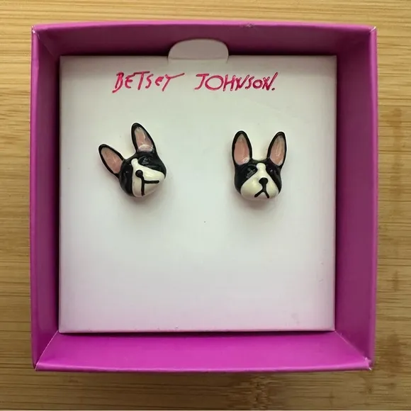 Charming French Bulldog earrings by Betsey Johnson. Features black and white design with pink accent... Show more