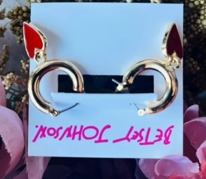 Playful and bold Betsey Johnson gold-tone huggie hoop earrings featuring a vibrant red heart drop. D... Show more