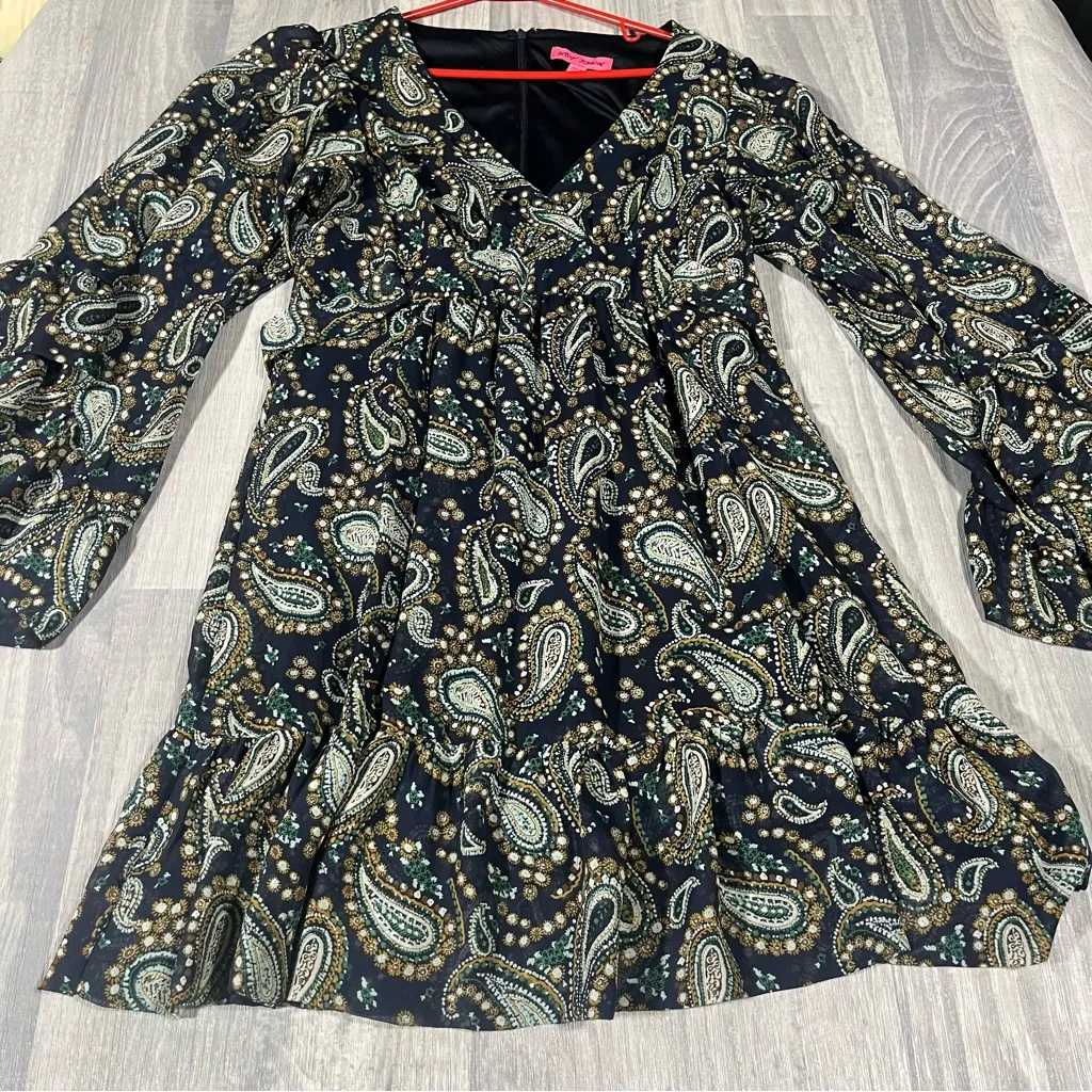 Chic Betsey Johnson dress. Features elegant Navy Blue and green hues. Perfect for any occasion. Bets... Show more