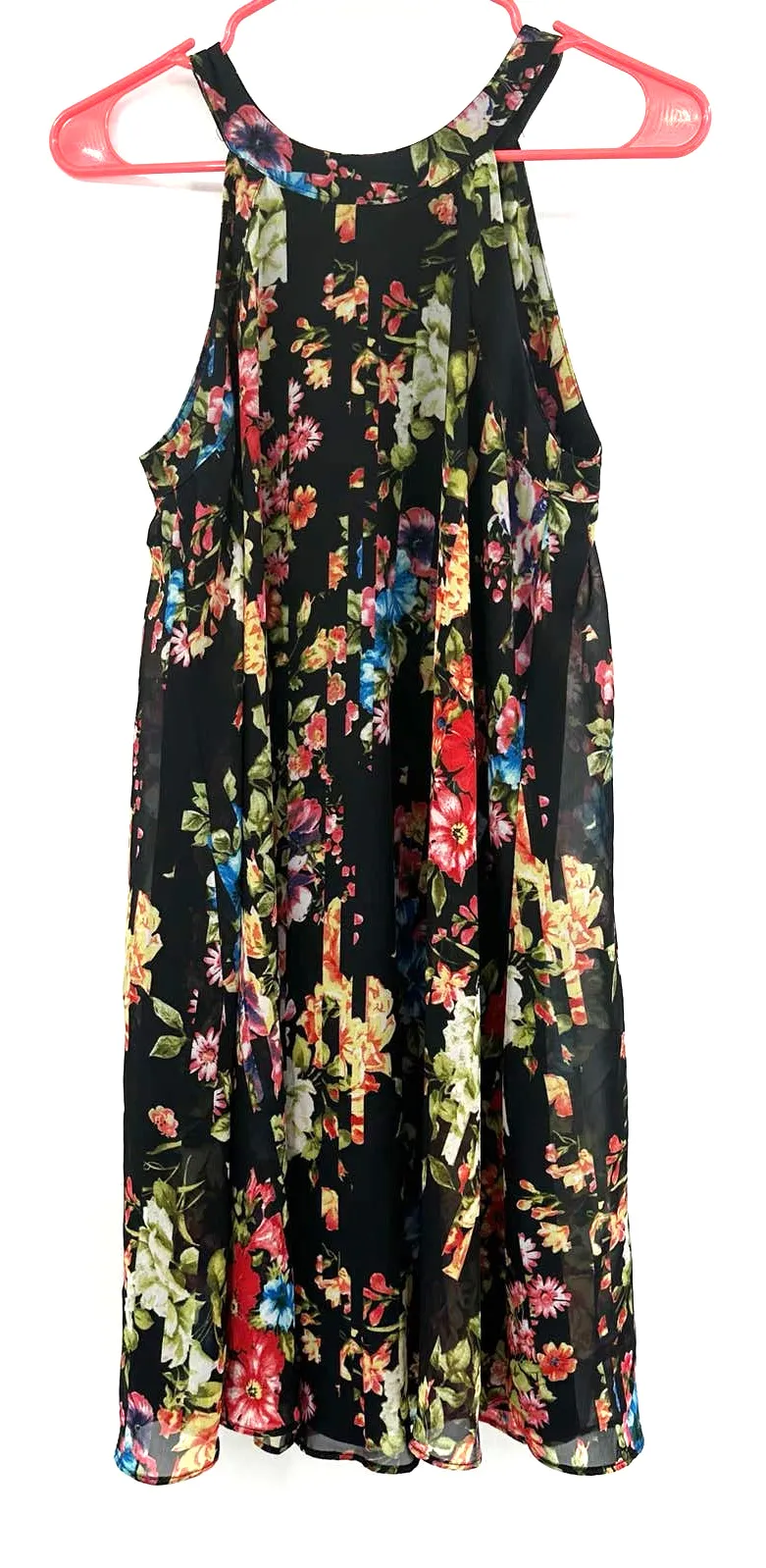 Betsey Johnson size 2 sleeveless swing style dress black with colorful floral print hidden rear zip... Show more