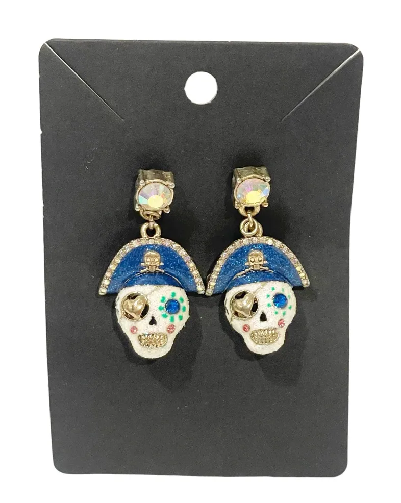Betsey Johnson Sugar Skull Pirate Earrings Jeweled Jewelry Excellent Pre Owned Condition