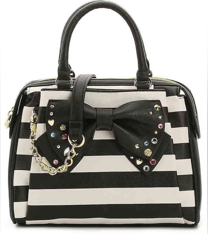 Y2K Coquette Glam Betsey Johnson “Be Mine” Collection Striped Satchel Bag – Black White Stripes, Bow... Show more