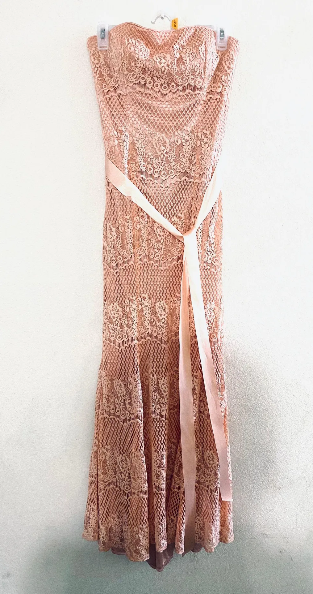 Very pretty peach lace and netting mermaid style dress with a slight train-satin slip underneath with a satin ribbon around the waist very heavy ,like new condition. worn one time, size 10. Perfect for a beach wedding dress or prom.