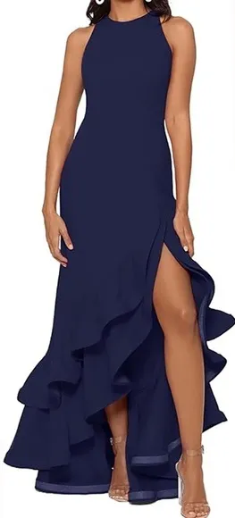 Betsy and Adam. Arielle Scuba Crepe Ruffle Slit Gown. Color: Navy Size: 2 Brand new, with tags. In new retail condition, but ruffles will need a good pressing. The Arielle Scuba Crepe Ruffle-Slit Gown is a classic formal gown designed for black-tie events. Smooth, medium-weight scuba crepe delivers a structured drape with gentle stretch that shapes without wrinkling. A clean halter high neck meets a fitted bodice, then a cascading ruffle opens to a thigh-high slit that moves easily and lengthens the line. Fully lined for comfort, the back closes with a polished gold zipper that keeps the profile sharp. True-to-size cut skims the waist and hips; stretchy fabric accommodates curves while keeping its form. Bra-friendly bust, fitted yet flexible waist, and spot-clean care make getting ready simple. Style it with minimal metallic heels for galas, weddings, proms, or any moment that calls for refined presence. Approximate lay flat measruements: Waist: 12" Under arm to under arm: 15" Length from top shoulder: 61" S-F2-20