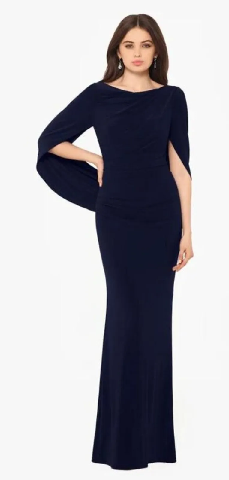 Purchased but was never worn. Stay bold and take on the challenges of the night in our "Miriam" Long Knit Draped Gown. Made with comfortable knit material and fully lined for a smooth fit. Featuring a hidden back zipper for a sleek look and boat neck with draped sleeves for a touch of drama. Be fearless in this straight fit gown. PRODUCT DETAILS: Material: Knit Lining: Fully Lined Closure: Hidden Back Zipper Details: Boat Neck, Draped Sleeves, Straight fit FABRIC DETAILS Jersey Knit - Jersey knit fabric is a soft, stretchy material characterized by its smooth, flat surface on one side and a slightly textured, looped underside. It is typically made from cotton, polyester, or a blend of fibers and is known for its comfort and versatility. Jersey knit drapes well and has good elasticity.