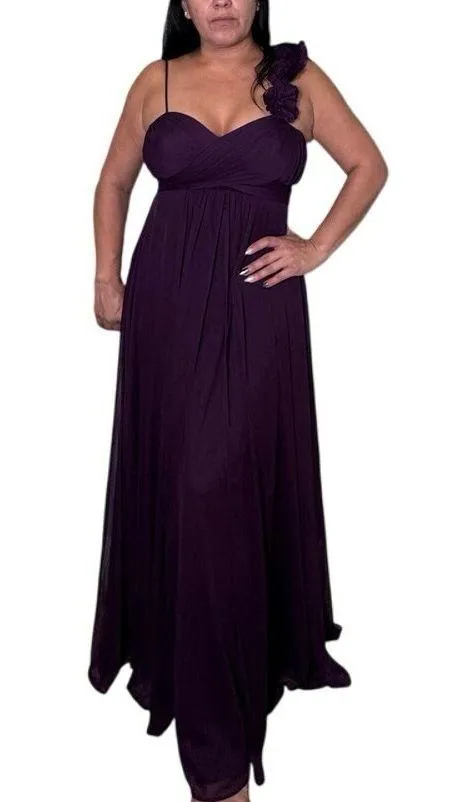 Elegant and timeless, this Betsy & Adam formal gown features a one-shoulder design with rosette floral accents and flattering ruching throughout the bodice. Perfect for weddings, galas, or any special event. • Brand: Betsy & Adam • Size: 8 • Style #: 10419 • Color: Deep Purple / Eggplant • Fabric: 100% Polyester • Lined, flowy chiffon overlay • One-shoulder floral rosette strap • Empire waist with ruched bodice • Concealed side zip • Made in the USA of imported fabric Condition: Excellent pre-owned condition Measurements (flat lay): • Bust (pit to pit): ~17” • Waist: ~14” • Length (shoulder to hem): ~60”
