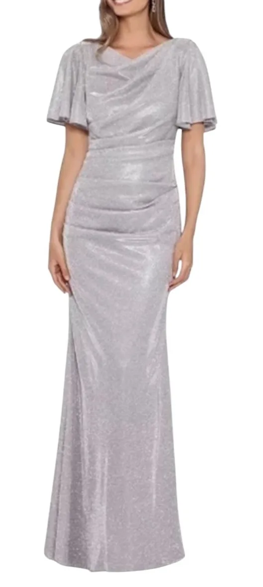 Radiant elegance awaits with this stunning Betsy & Adam silver glitter gown! Its figure-flattering design is complemented by a gracefully draped cowl neckline and flouncy flutter sleeves. It's a size 4 and is in excellent preloved e. Ruched detailing further accentuates your curves, flowing down into a floor-length skirt that moves with effortless grace. This gorgeous gown will ship quickly from a smoke free home. Keywords: silver gown, metallic dress, evening dress, formal gown, party dress, pageant dress, special occasion, cowl neck, flutter sleeves, ruched dress, Betsy Adam, size 4, long gown, maxi dress, fitted dress