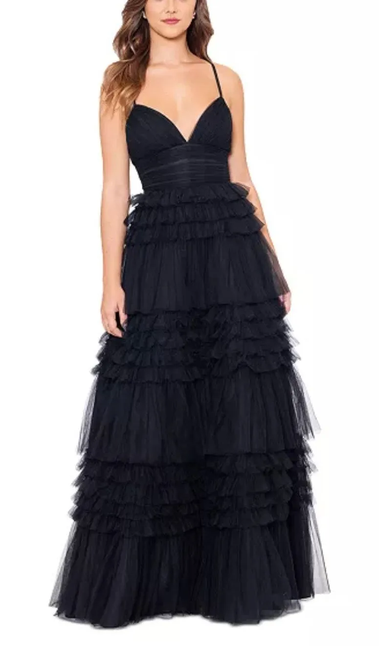 Betsy & Adam Women's V-Neck Sleeveless Tiered Ruffle Mesh Gown - New w/ Tags - 1 Strap Flaw Size - 4 Color - Black -Turn heads in this enchanting women's mesh tiered ruffle ballgown from Betsy & Adam, designed to make you feel like the belle of the ball with its cascading layers and whimsical charm -Imported -Floor-length formal dress with a skirt that flares from the waist -Mesh fabric -V-neck; Ballgown silhouette -Back zip closure -Sleeveless with adjustable cross-back strap -Banded at waist; tiered ruffle trim at skirt -Lined Approx. Measurement - laying flat, not stretched out: AP to AP - 15" Waist - 13.5" Shoulder to Bottom Hem - 65" Fabric: 100% Polyester Retail: $180 *Dress comes as shown in the photos - Please review all pictures in the listing before purchase. *1 flaw on the strap - it can be sewn back on. Right now it's tied around the small ring. See Pic #11. Reflected in price *Overall, Great Condition! New w/ Tags Ships Fast