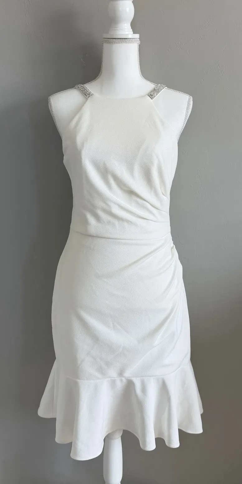 Gorgeous preowned dress by Betsy & Adam. Please review photos carefully, there are a few flaws to be aware of before purchasing: small snag in fabric located on the lower back left side of the dress as well as a small tear in the seam on the backside at the end of the zipper. Could be very easily repaired. NO Major stains, holes or other flaws. More details below: Woman's size 6 Pit to pit: 16" Waist at its narrowest point: 13" knee length Solid white with silver/white bead and crystal embellishments on straps (spaghetti strap) round neckline Left side sinched waist accent mermaid style: fitted silhouette with a flare at the bottom of the hem STYLE # A23722 Polyester and spandex blend Great for a wedding, rehearsal dinner, bachelorette party, bridal shower, brunch, special occasion, prom, gala, special event, birthday party, festival