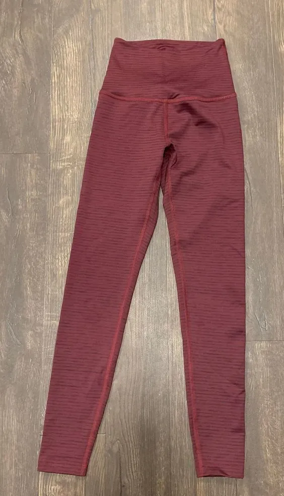 Beyond Yoga burgundy workout leggings with thin black stripes. Soft, with great support for yoga, running, and other workouts. Approximately 9.5 inches across the waist, 10 inch rise, and 25.5 inch inseam. In good, used condition. From a pet and smoke free house. Happy to bundle!