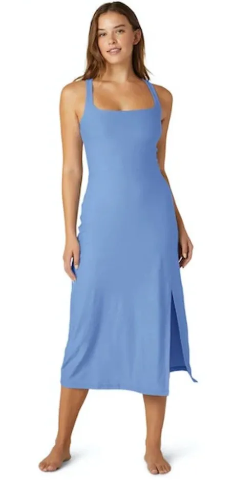 In excellent condition! Size - Large Length - 48.5 inches Pit to pit - 16.5 inches The dress for both out of town and on the town, day or night. The Beyond Yoga Featherweight Getaway Dress is timelessly designed, with midi length and square neckline, fitted on the waist with a side slit on leg. And because it's Featherweight, you know you'll be comfortable, thanks to all that lightweight, UPF blocking softness. Features Square neckline Self lining Slit at front side Mid calf length, 48" high point of shoulder to hem Uniquely created to flatter every shape Details Fabric: 94% Polyester, 6% Spandex Care: Easy care - wash and dry. Country of Origin: Made in the USA