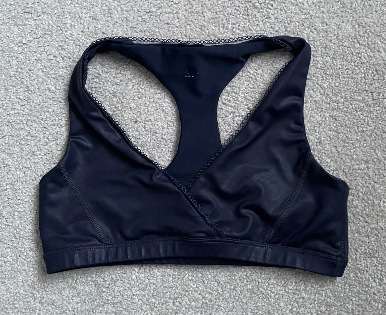 Elevate your workout with this Beyond Yoga racerback sports bra, designed for ultimate comfort and stylish support. The smooth, sleek fabric glides against your skin, offering a luxurious feel with every movement. Its V-neckline and intricate lace trim add a touch of feminine elegance, ensuring you look as good as you feel. The racerback design provides excellent freedom of movement and breathability, making it perfect for yoga, Pilates, or light gym sessions. Measurements: • Underbust: 13 in • Length: 12 in • Cup width: 6 in Type: Bra Support Level: Medium Style: Sports Bra Features: Stretch, Plunge, V-Back, Breathable Performance/Activity: Yoga, Athleisure, Pilates, Running & Jogging, Gym & Training Material: Polyester Blend, Nylon Blend, Faux Leather Fabric Type: Satin Strap Type: Racerback Closure: Pullover Accents: Lace, Logo Keywords: Beyond Yoga, racerback, sports bra, navy, blue, medium support, activewear, athleisure, yoga, Pilates, gym, workout, fitness, lace trim, V-neck