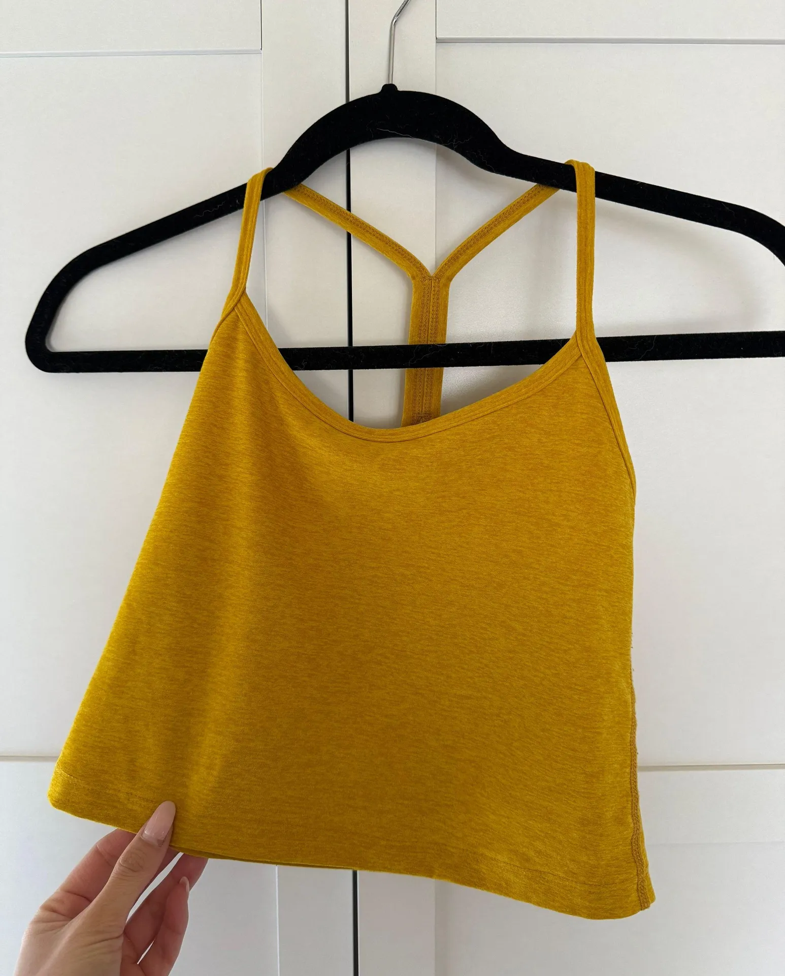 Worn only once! Softest material, my favorite type of tank! Color: Mustard yellow (old color) It's everyone's favorite super soft Spacedye! This best-selling skinny racerback tank features a shelf bra for medium support. With cute cropped silhouette, it's the perfect wardrobe staple. Made in the USA Ultra soft with lots of stretch Racerback design shows off shoulders Cropped length Shelf Bra built in Ultra Soft Feel 4-way Stretch To Move With You Moisture Wicking To Keep Dry Easy Care - Wash + Dry Enjoy The Sun With UV Protection 87% Polyester, 13% Elastane