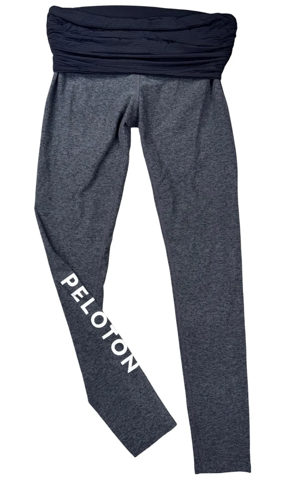 Excellent Condition Gray leggings featuring a fold-over waistband and the Peloton logo on the lower... Show more